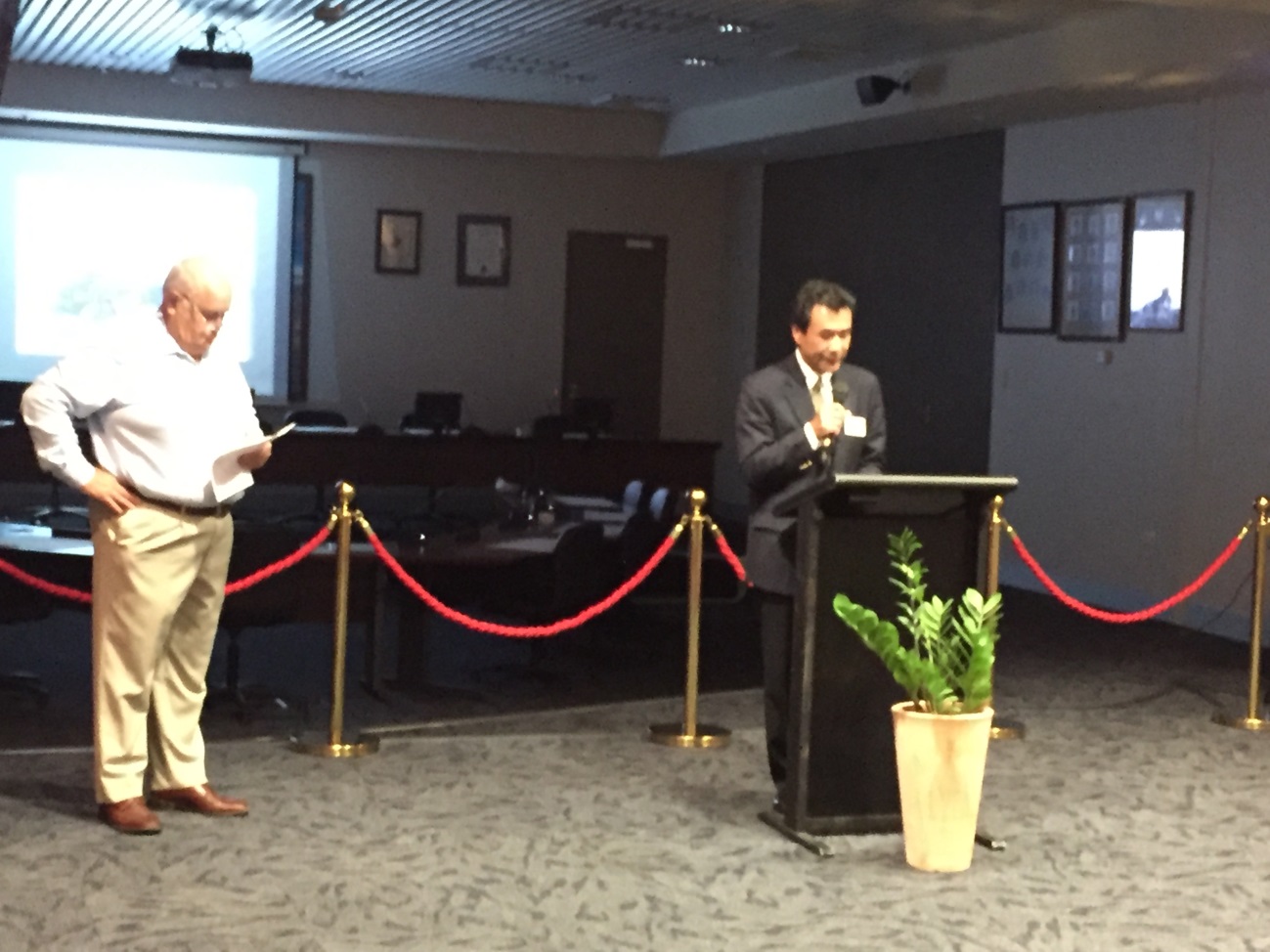 3月2日、シビックレセプションにおける平山総領事スピーチ(隣はジョンストン・ブルーム町長) |