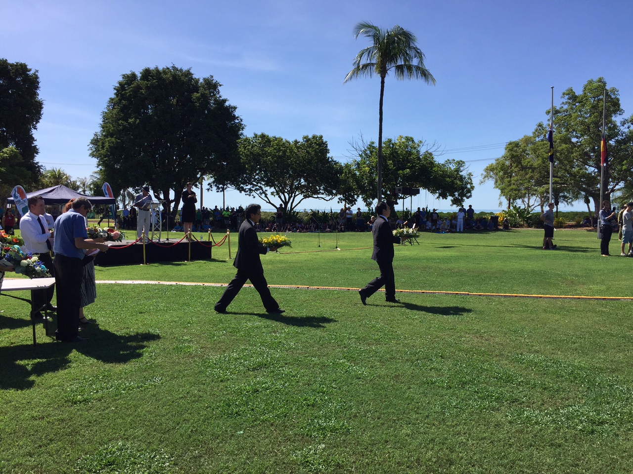 式典で献花に向かう片江公使及び平山総領事。 |